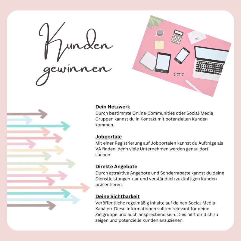 Als VA kann man Kunden gewinnen, indem Dienstleistungen und Fähigkeiten effektiv vermarktet werden.